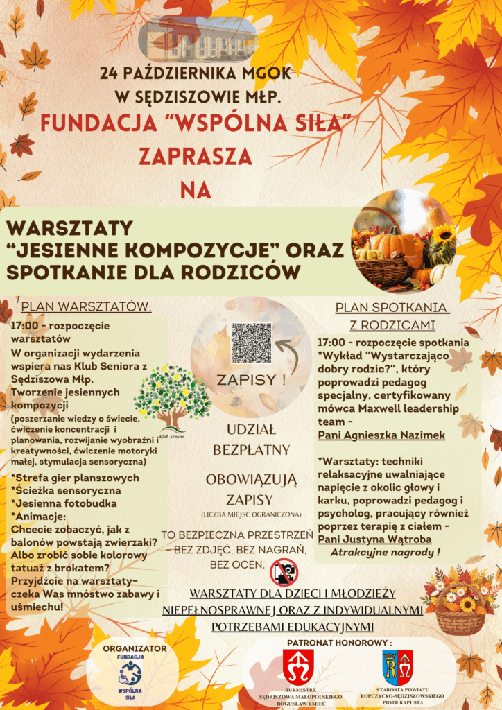 Fundacja „Wspólna Siła” serdecznie zaprasza na warsztaty dla dzieci z indywidualnymi potrzebami edukacyjnymi, które odbędą się 24 października (piątek) w Miejsko Gminnym Ośrodku Kultury w Sędziszowie Małopolskim. ![]()